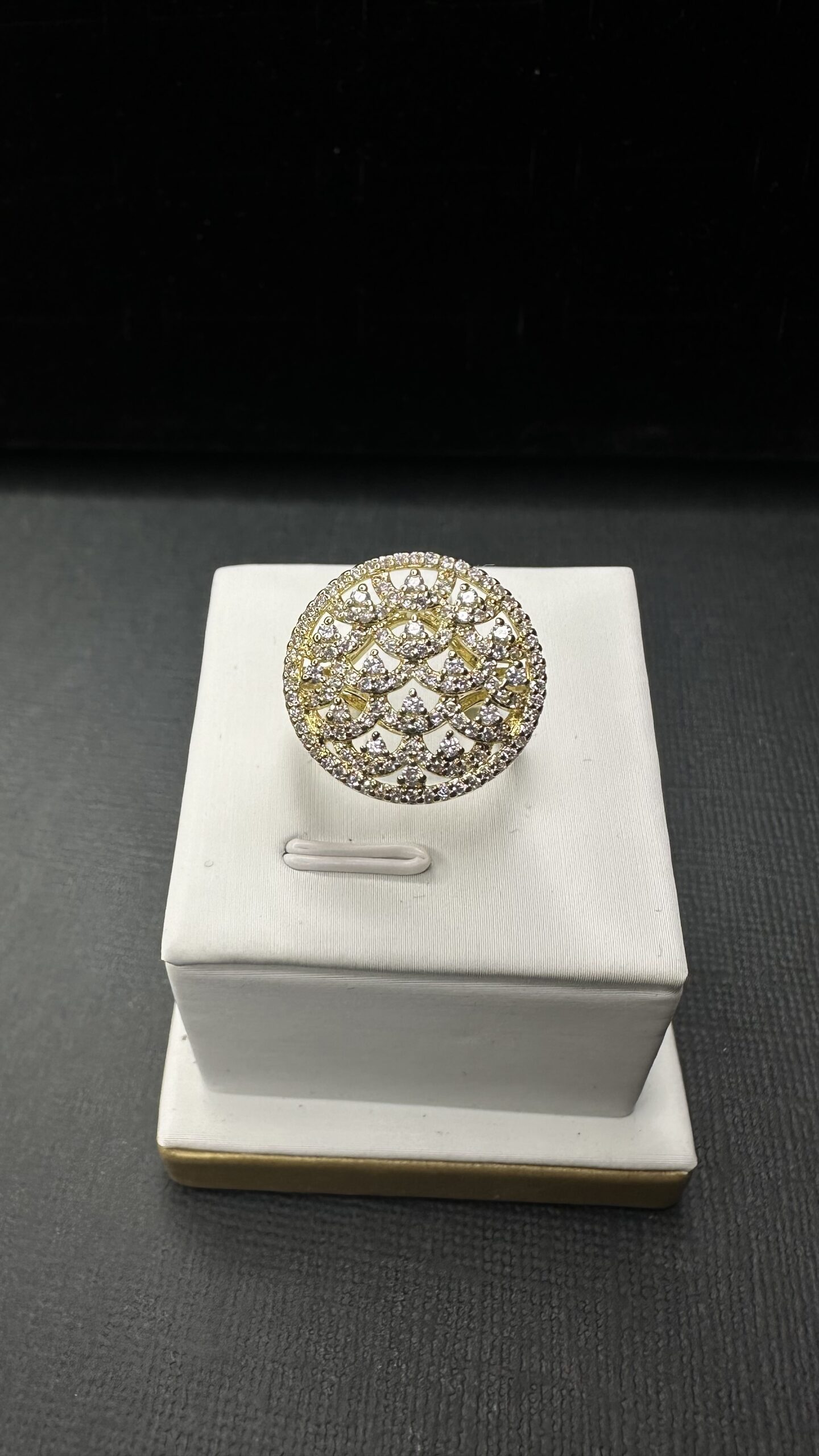Anillo bañado en oro de 24 kilates diseño redondo calado con circones engastados.