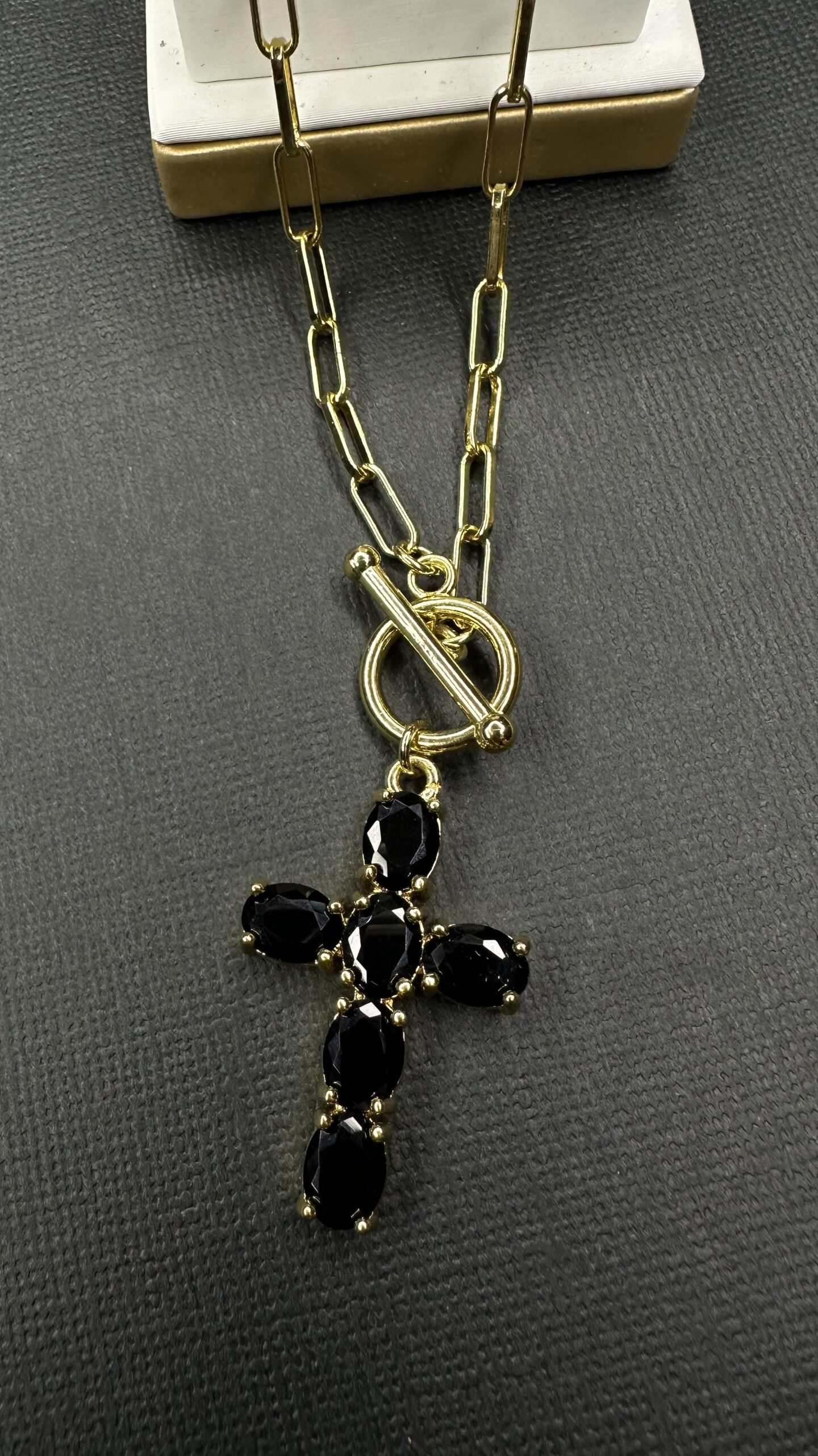 Collar eslabones delgados con cierre náutico. Colgante cruz circones negros engastados en base bañada en oro de 18 kilates.