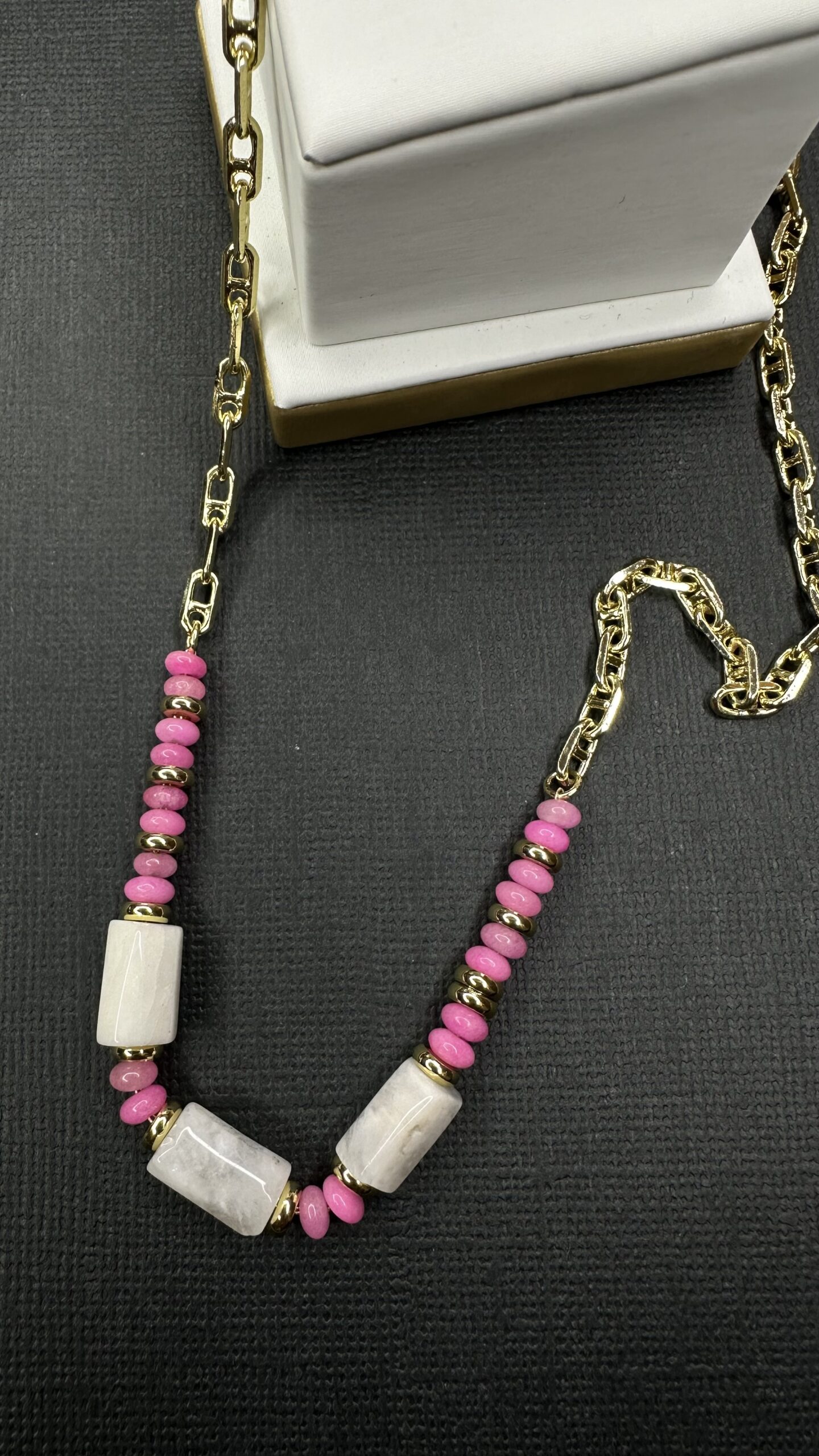 Collar bañado en oro de 24 kilates con aplicaciones de cuarzo blanco y cuentas rosadas.