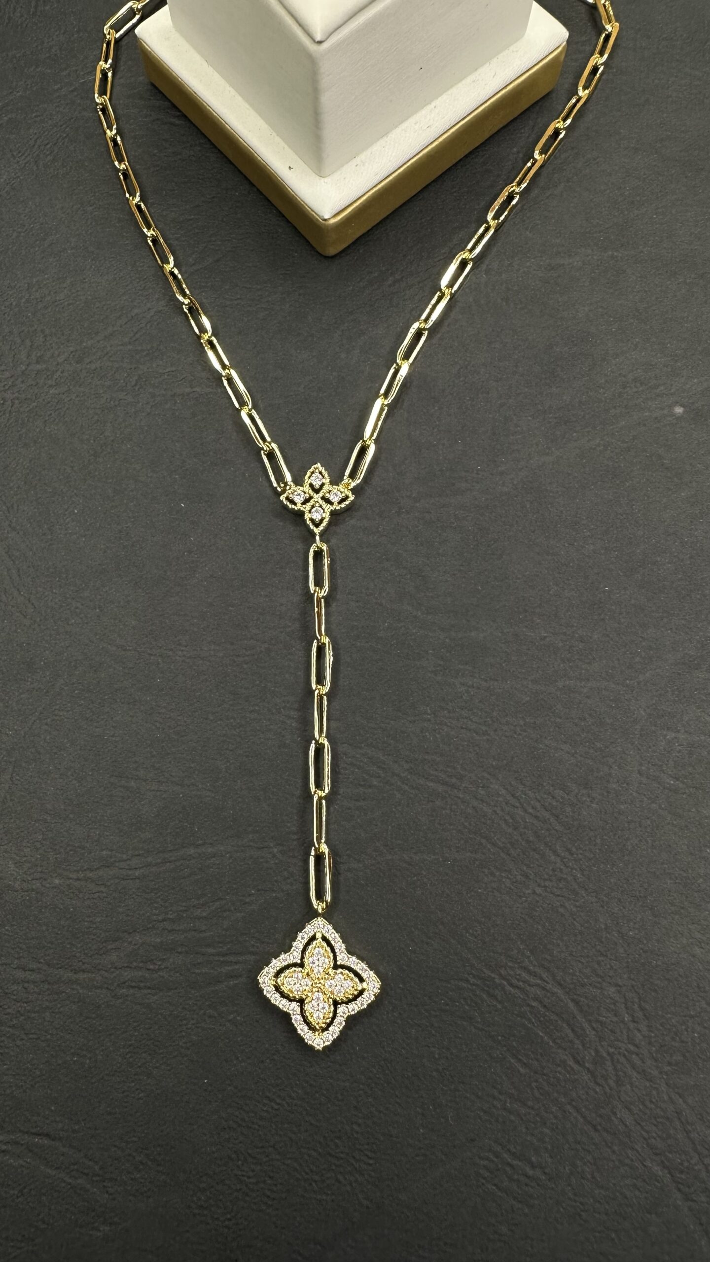 Collar eslabones delagados y doble trébol en cascada con circones engastados.